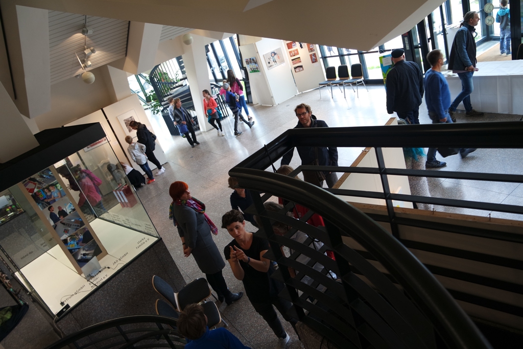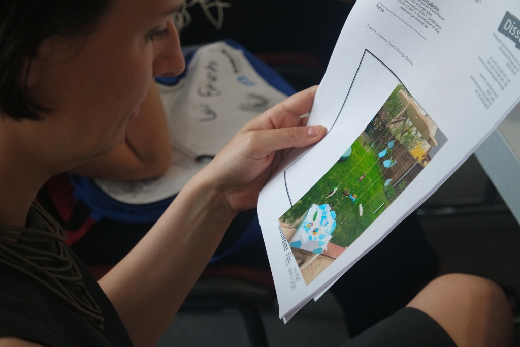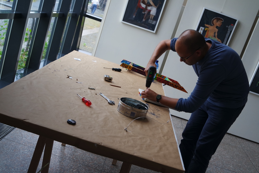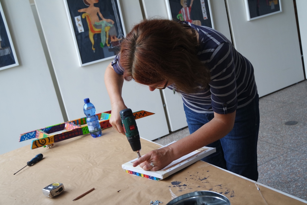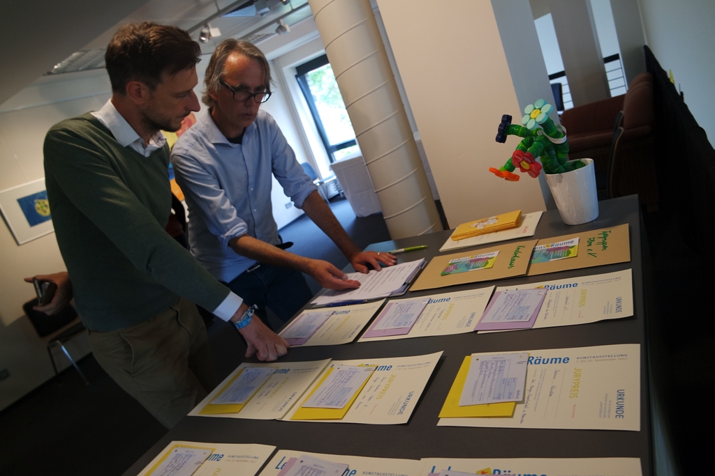 Während des Aufbaus konnten zum ersten Mal die künslerischen Arbeiten der Kinder und Jugendlichen in Gänze betrachtet werden. Detailansichten waren nun möglich. Die Mitglieder der Jury kannten die Arbeiten bisher nur auf der Grundlage von Fotografien. Teilweise waren die Arbeiten, die Anfang des Jahres eingereicht worden waren, auch noch unvollständig.