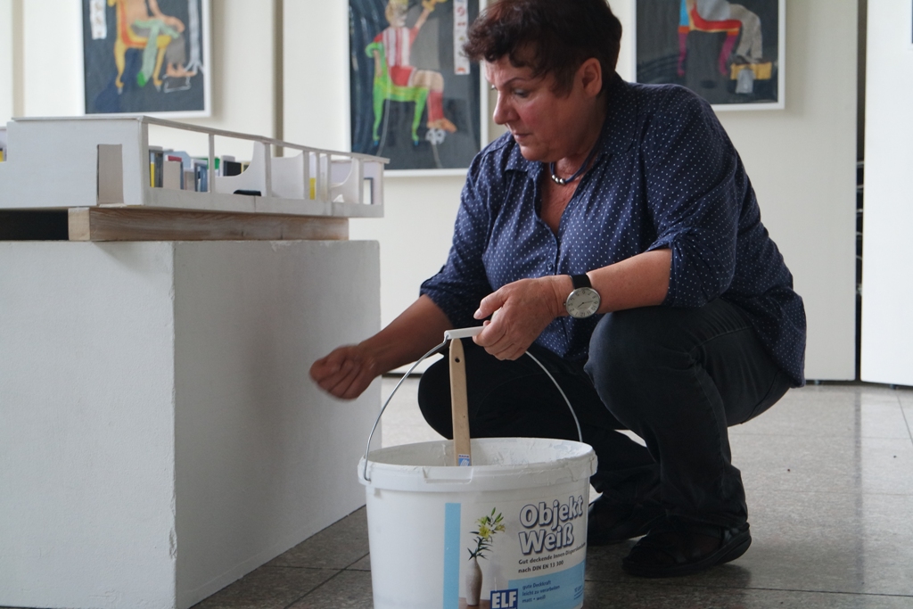 Bis zur Eröffnung der Ausstellung waren es knapp 4 Tage. Viele Helfer*innen stimmten sich zum Aufbau ab. Unterschiedliche Tätigkeiten waren notwendig: positionieren, schrauben, kleben, hängen, ausrichten, drucken, schneiden, anstreichen, hämmern, abstimmen, unterschiedliche Ideen besprechen, andere Meinungen aushalten, polieren, fegen, wischen. Und wahrscheinlich vieles Andere mehr. Was jeder Einzelne der Helfer*innen gar nicht so mitbekommen konnte.
