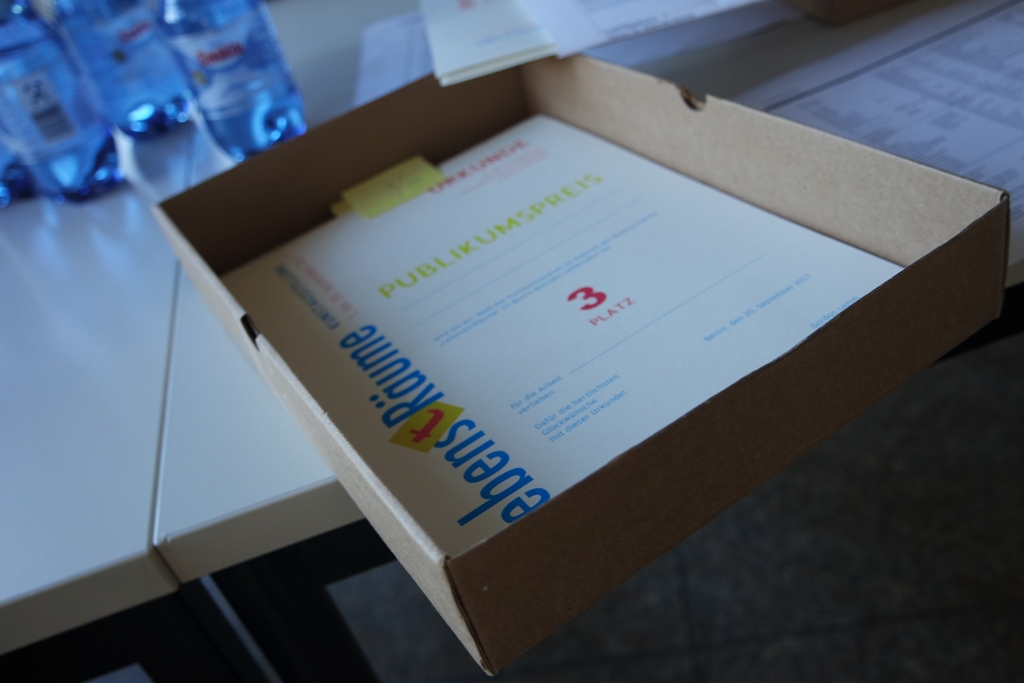 Wir beginnen mit der Bekanntgabe der Publikumspreise. Drei Künstler*innen beziehungsweise Künstlergruppen werden eine Urkunde von Gordon Lemm, Stadtrat und Schirmherr unserer Ausstellung, überreicht bekommen und das Preisgeld entgegennehmen.